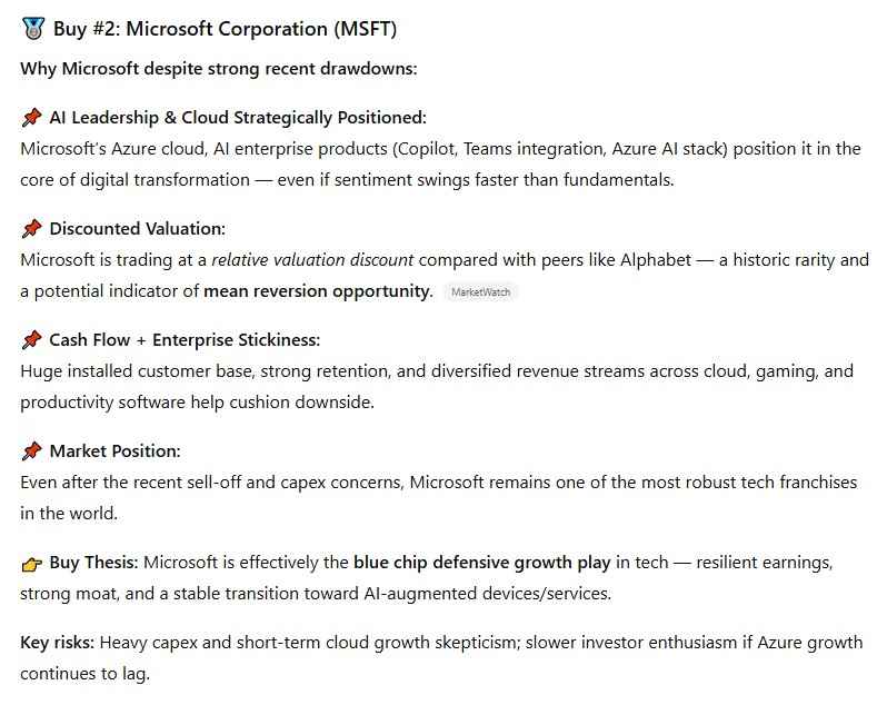 Furthermore, the AI platform took the recent correction as another part of the bull case, explaining that, at its current valuation, the technology giant is actually trading at a discount, possibly reinforcing the ‘growth’ aspect of the ‘blue chip defensive growth play in tech’ description it gave to the Bill Gates-founded company.