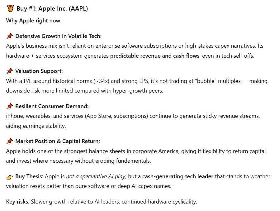 Despite anticipating somewhat slower growth for the company, the AI recommended Apple (NASDAQ: AAPL) stock as its first pick for February.