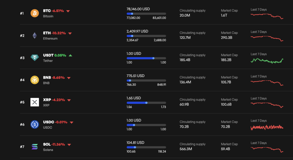 In this context, major cryptocurrencies were firmly in the red. Bitcoin, the market’s largest asset, slid more than 6% over the period, trading near the mid-$78,000 area after breaking below several key technical levels.