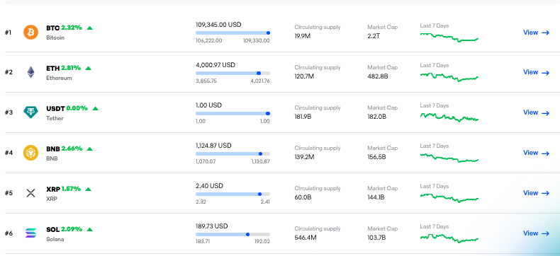 Bitcoin (BTC) led the rally, climbing 2.32% to trade around $109,345, pushing its market capitalization to $2.2 trillion. Ethereum (ETH) followed with a 2.81% increase to $4,001, maintaining its position as the second-largest cryptocurrency with a market value of $482.8 billion.