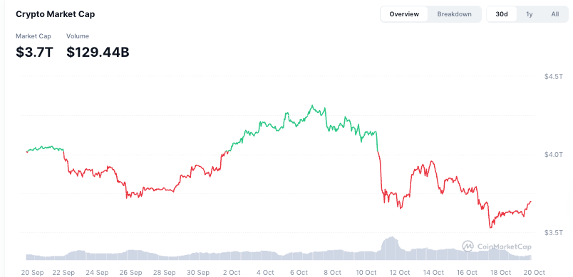 As of press time, the total market capitalization stood at $3.7 trillion, up from $3.6 trillion a day earlier, according to data retrieved from CoinMarketCap.