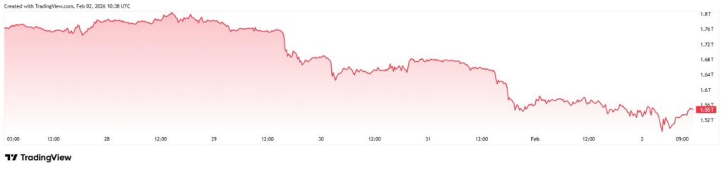 Within just one week, the total cryptocurrency market capitalization collapsed by approximately $400 billion, falling from about $2.95 trillion to approximately $2.56 trillion by press time on February 2, 2026, as per data calculated by Finbold.