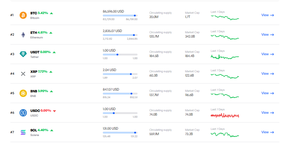 XRP delivered one of the strongest advances, climbing 7.72% to $2.04, while BNB added 3.90% to reach $847.07. Solana gained 4.40%, lifting its price to $131.
