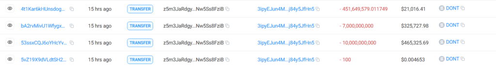 Some of the later trades were even more impressive. About five hours after the initial purchase, the trader offloaded more than 17 billion DONT across four successive trades, raising more than $800,000.