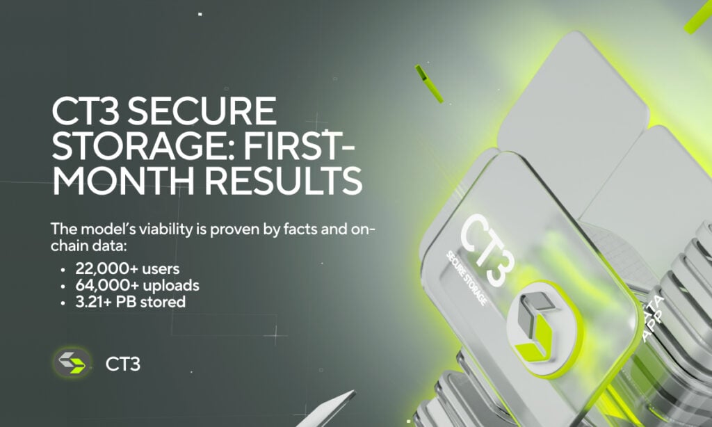 CT3 today released first-month operating results for CT3 Secure Storage, confirming strong early demand for secure storage with long prepaid terms and transparent, verifiable commitments. In its first 30 days, CT3 recorded 64,000+ private uploads from 22,000+ unique users, alongside six corporate long-term archiving contracts. In total, the network secured 3,217,639.88 GB (≈3.21 PB) of data during the first month- clear evidence that CT3’s model is not theoretical, but already working at meaningful scale.