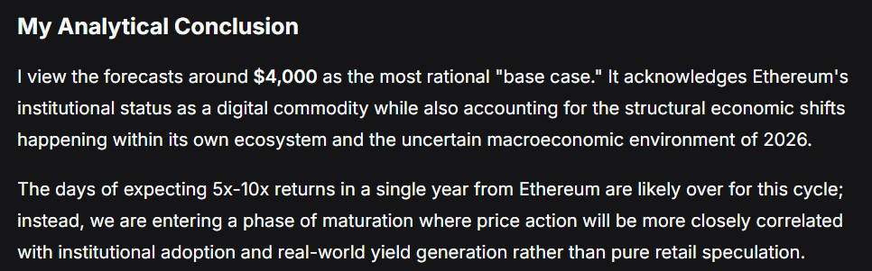Prompted to give an analytical conclusion with a more precise base-case scenario figure, the large language model settled on a $4,000 price target. This price, the algorithm reasoned, highlights Ethereum’s status as a digital commodity while also accounting for economic shifts within its own ecosystem, as well as the uncertain macroeconomic environment of 2026.