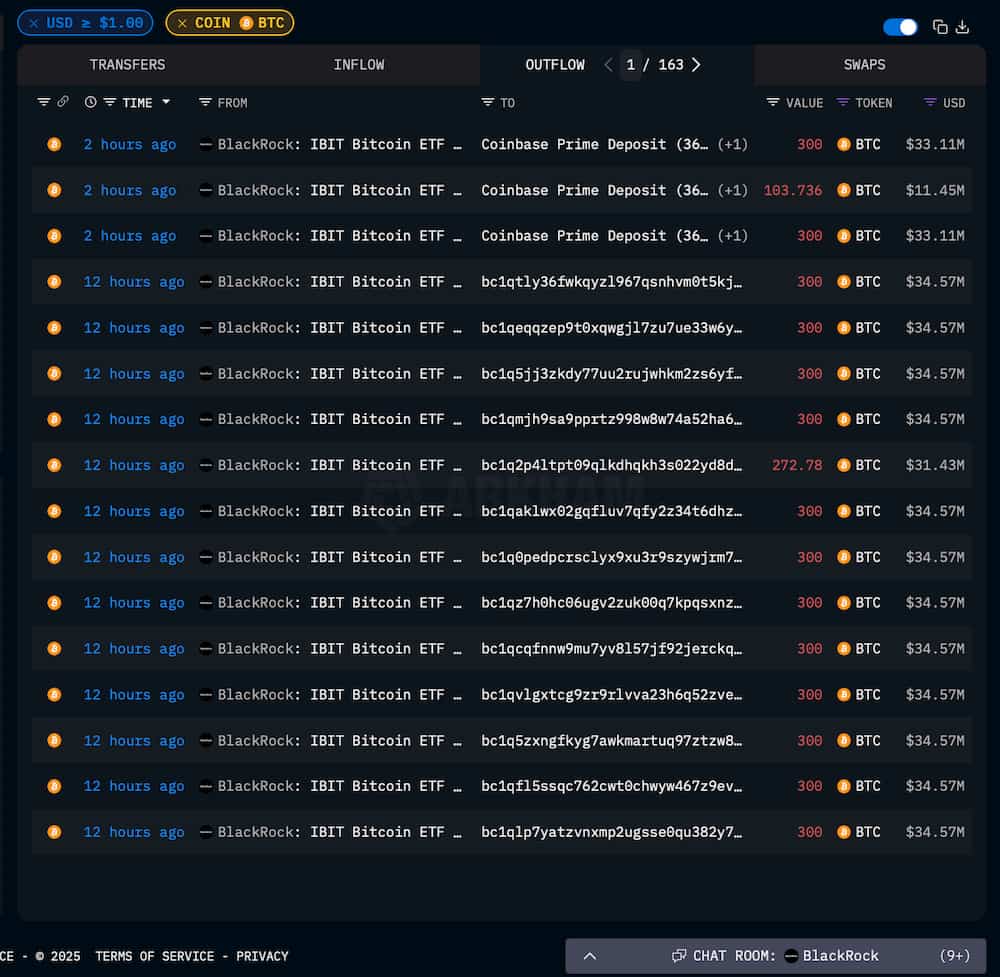 At first glance, data retrieved by Finbold from Arkham seems to support the rumor. In the past 12 hours, IBIT-linked wallets processed a series of transfers totaling 9,376 BTC, worth more than $1.04 billion at current prices. But a closer look reveals a far more nuanced picture than the headline-grabbing “dump” suggests.