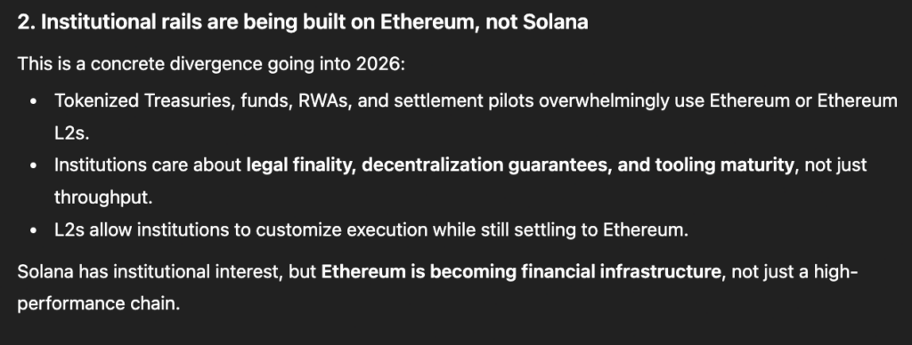 ChatGPT also sees a widening institutional gap, with tokenized Treasuries, real-world assets, funds, and settlement pilots concentrated on Ethereum and its layer-2 networks. These users favor legal finality and mature tooling, reinforcing Ethereum’s role as core financial infrastructure, while Solana has yet to show comparable settlement-driven adoption.