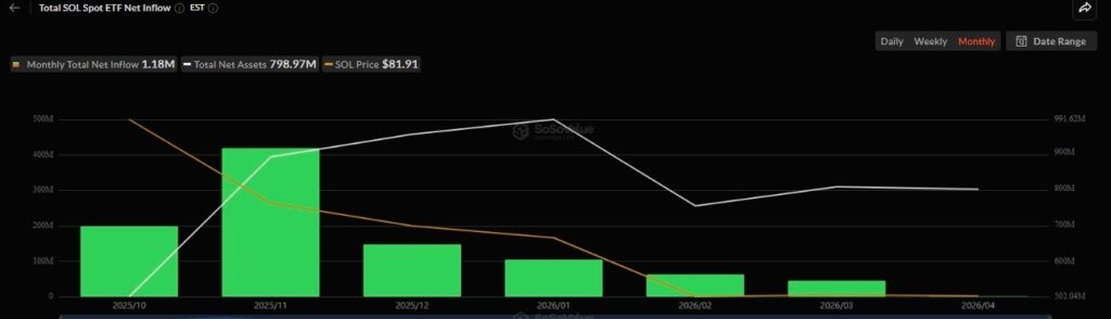 Additionally, the institutional demand for Solana through spot SOL exchange-traded funds (ETFs) has gradually dropped in the past two quarters from a peak of $419 million in November 2025 to about $1.18 million in March, as per metrics from SoSoValue.