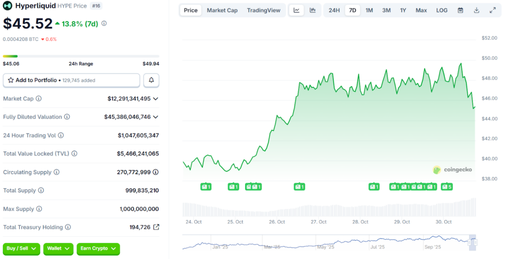 Technically, Hyperliquid’s price remains well-supported by the 100-EMA, while the RSI’s brief cooling phase suggests healthy consolidation rather than weakness. If bulls push the token above $49, upside targets between $52 and $100 could follow swiftly.