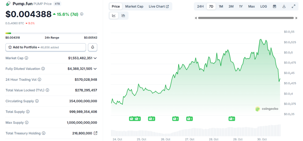 The Pump.fun token (PUMP) has quietly climbed above $0.0042, supported by renewed whale accumulation and soaring platform revenue. According to Spot On Chain, over 2.2 billion PUMP tokens were withdrawn from exchanges this week, a clear indication of long-term positioning.