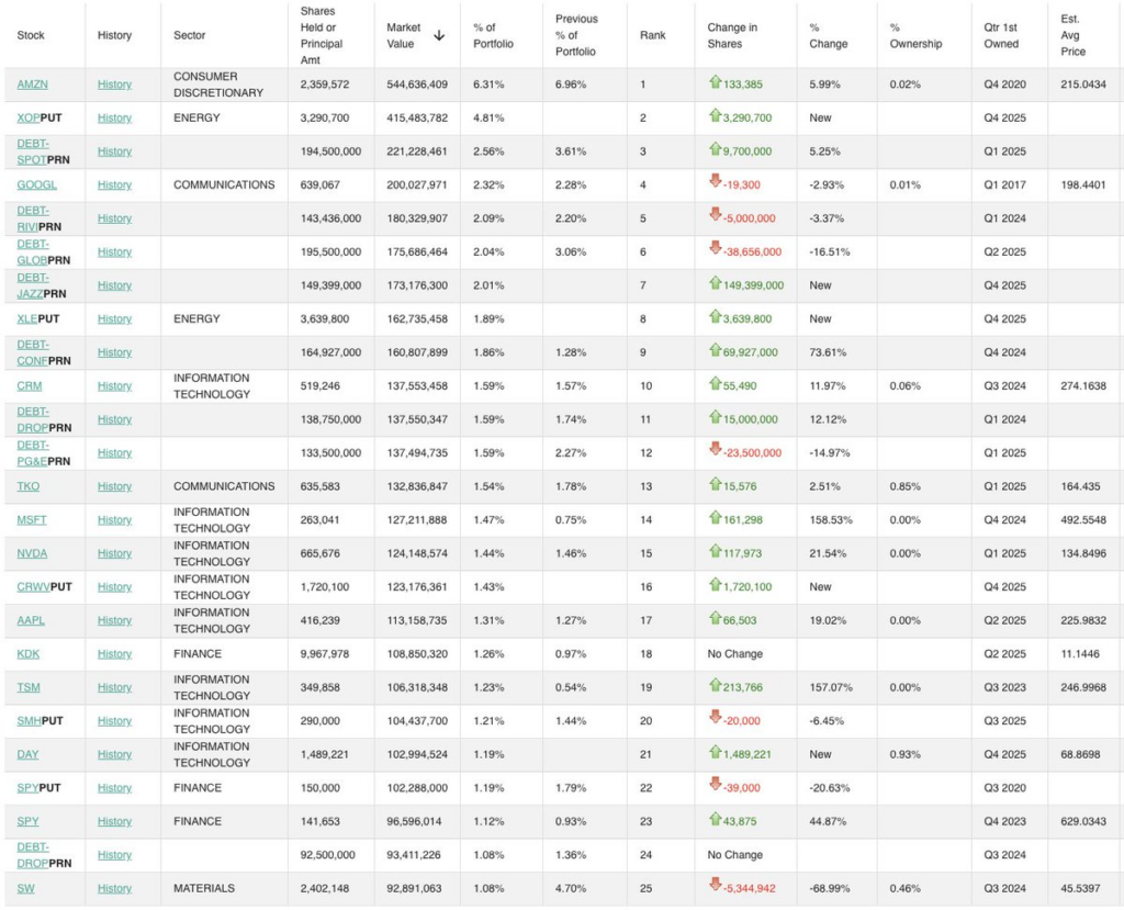 The update shows a pivot toward bearish energy bets, increased exposure to artificial intelligence and semiconductors, and a full retreat from leveraged China positions in the last quarter of 2025.