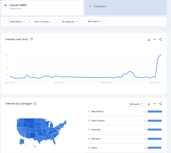 The data also highlighted where the trend is most pronounced. States such as New Mexico, West Virginia, Kentucky, Montana, and Idaho registered the highest relative search volumes for “cancel Netflix.”