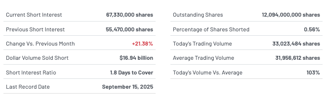 Current short interest stands at 67.33 million shares, up from 55.47 million in the previous reporting period, a 21.38% increase, according to data retrieved by Finbold from MarketBeat on October 13.