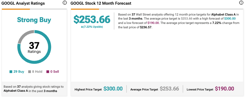 Forecasts range from a high of $300 to a low of $190, reflecting differing views on Alphabet’s growth prospects amid evolving AI competition and digital ad market dynamics.