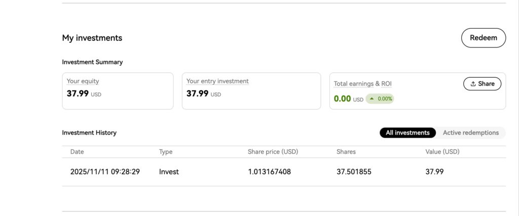 - Rules-based investment and redemption process: Investments and redemptions follow an on-chain, trustless flow — entry and exit mechanics are clearly defined.