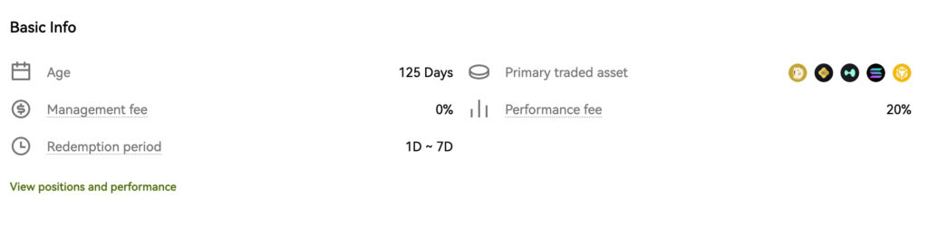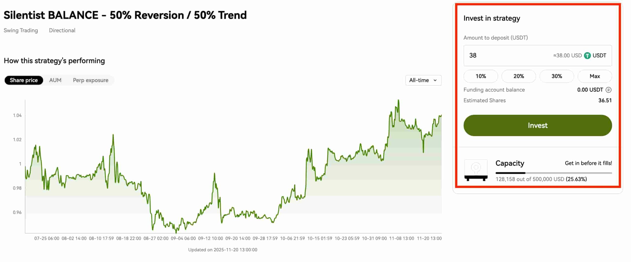 - Performance fee: Charged only when a strategy generates a profit for the investor. Managers can set this between 0% and 40%.