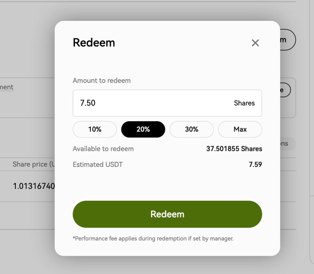 You can redeem by selecting your strategy in “My Investments,” choosing “Redeem,” and approving the transaction. Your shares are burned, and you receive USDT based on the current share price and the strategy’s redemption rules.