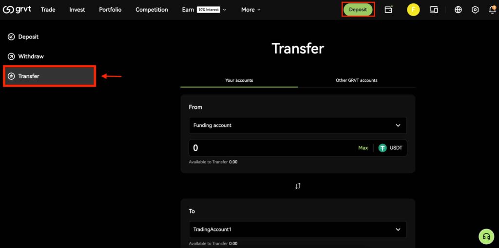 Once the deposit is credited, go to Deposit → Transfer. Set “From” as your Funding Account and “To” as your Trading Account. Enter the amount and complete the transfer.