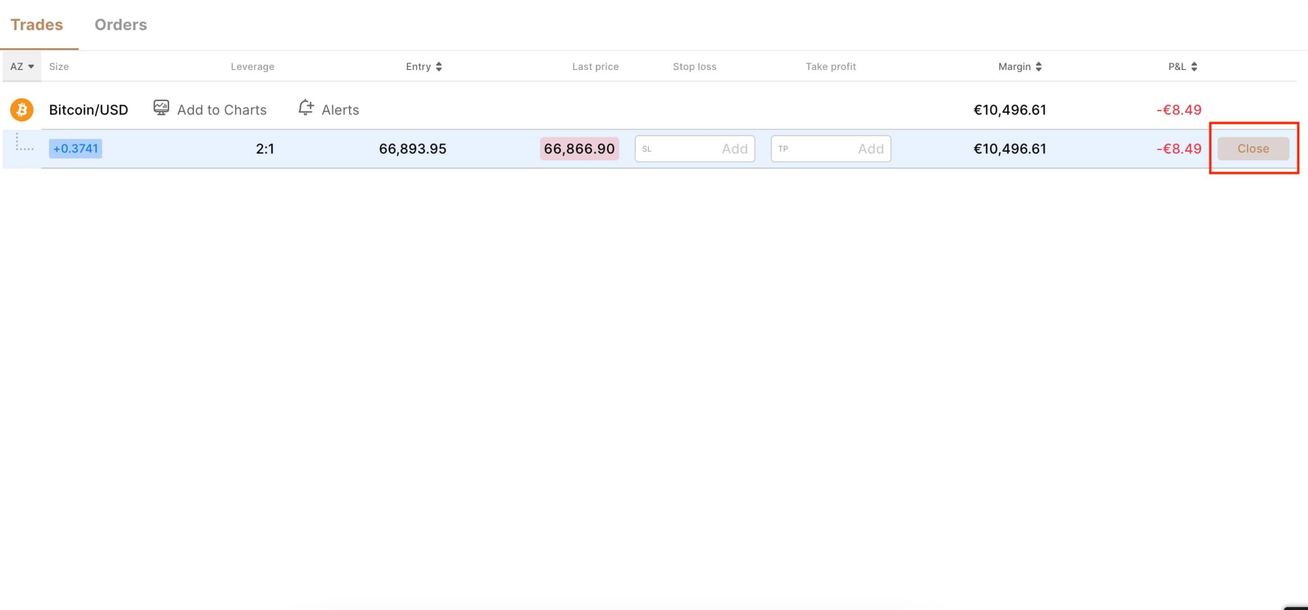 You can choose when to exit the market by closing your position manually or by using preset risk-management tools such as stop loss or take profit. To close a trade manually, simply select the open position in your dashboard and choose the close option.