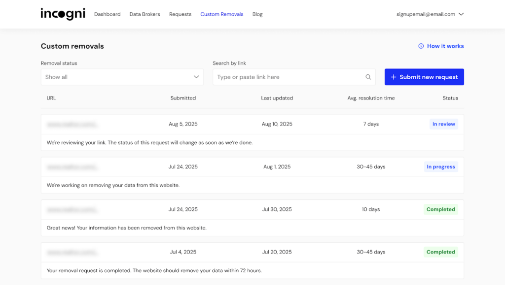 Incogni makes everything incredibly straightforward for every user. After creating your account and verifying your identity, the system generates and sends deletion requests to hundreds of brokers known to trade personal data. You can observe this process whenever you like through your personal dashboard.