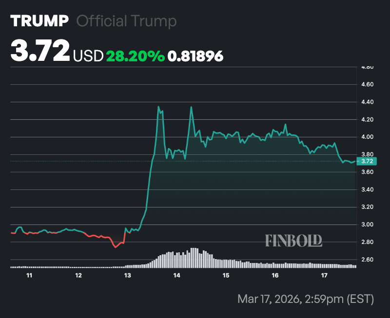 Notably, the announcement of the second gala has boosted momentum for the TRUMP token, which rose as much as 60% in a day, climbing from around $2.70 to above $4 before settling in the mid-$3 range. By press, TRUMP was trading at $3.72, down over 4% in the past 24 hours, while on the weekly timeline, the cryptocurrency has rallied almost 30%.