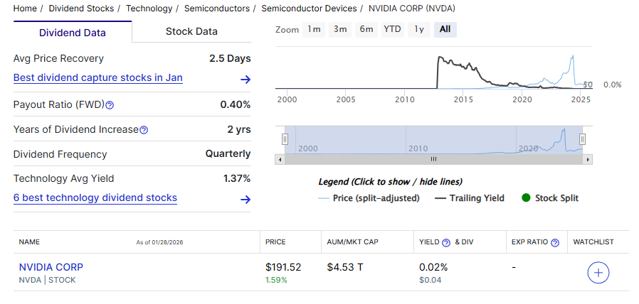 At a share price of about $191.5 at the time of writing, Nvidia offers a forward dividend yield of roughly 0.02%, below the 1.37% average yield for the technology sector.