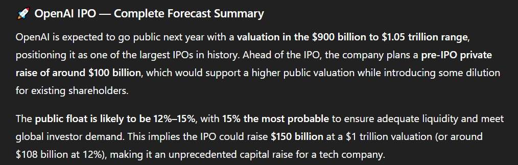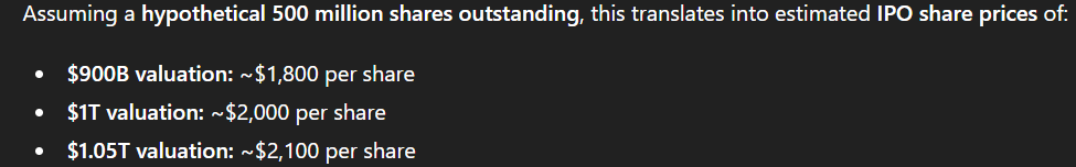 In response to the inquiries, the chatbot first noted that the $100 billion in fresh private funding by March 2026 would likely reinforce a higher public-market valuation. Accordingly, it argued for a figure in the $900 billion to $1.05 trillion range (one of the largest IPOs in history).