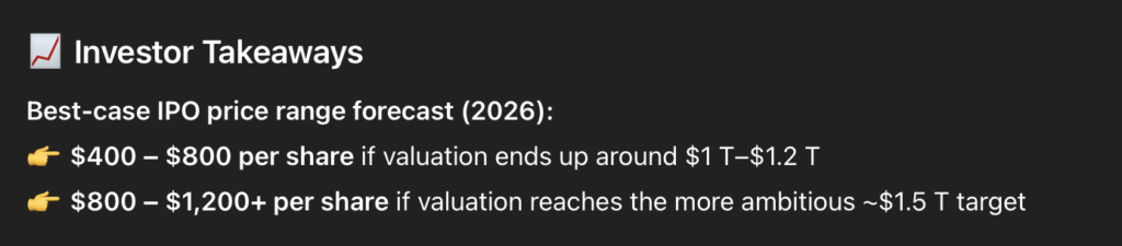 Should the space company meet these expectations, a $1 trillion–$1.2 trillion offering could be likely, implying a price of $400–$8000 per SpaceX share. On the other hand, an even more favorable, $1.5 trillion debut could push the pricing well above the $800 mark, potentially above $1,200.