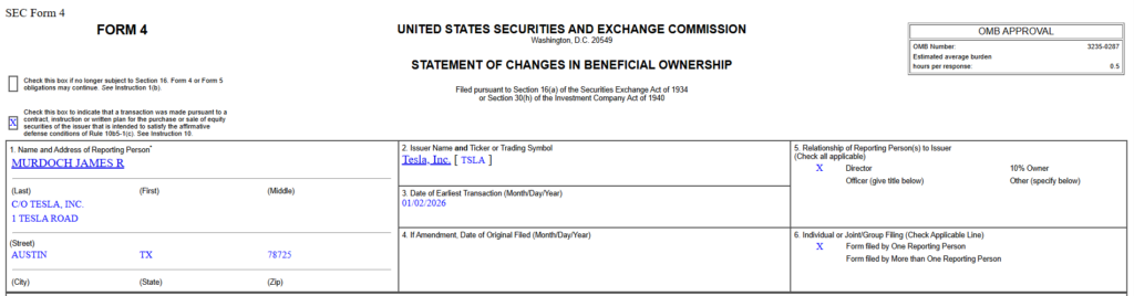 Form 4 recording James Murdoch’s January 2, 2026, Tesla stock sale. Source: SEC