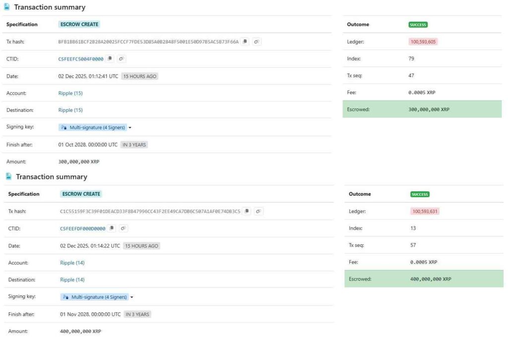 As has often been the practice, the company re-locked 70% of the release (700 million XRP) between 1:12 am (UTC) and 1:14 am (UTC), December 2, meaning the bulk of the batch returned to long-term storage almost immediately.