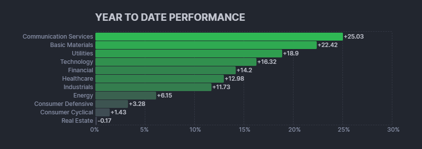 While real estate struggles to gain traction, several other sectors are powering ahead with massive gains YTD. For instance, communication services lead the market with gains of more than 25%, supported by strong advertising revenues, digital-platform monetization, and the solid performance of large-cap names such as Alphabet and Meta.