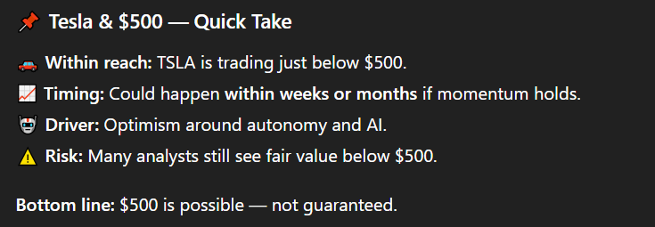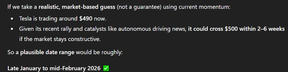 That would mean that Tesla investors’ long-standing dream of $500 per share would come true somewhere in late January or mid-February 2026.