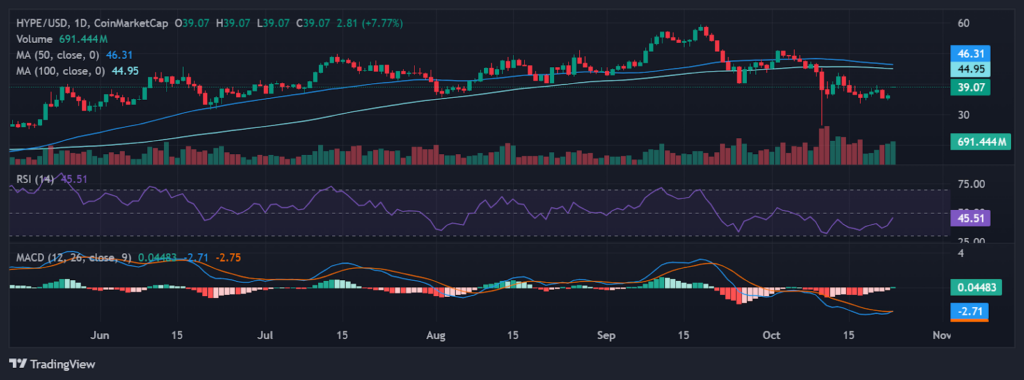 HYPE’s recent rally may still face headwinds. Both the 50-day SMA ($46.31) and 100-day SMA ($44.95) are trending above the current price, confirming a bearish trend.