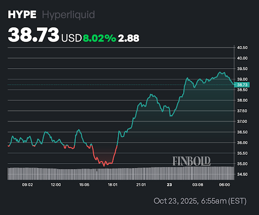 Notably, the price of HYPE surged 8%, rising from a low of $34.87 to as high as $39.06. With 336.7 million tokens in circulation, Hyperliquid’s market cap reached about $13.1 billion.