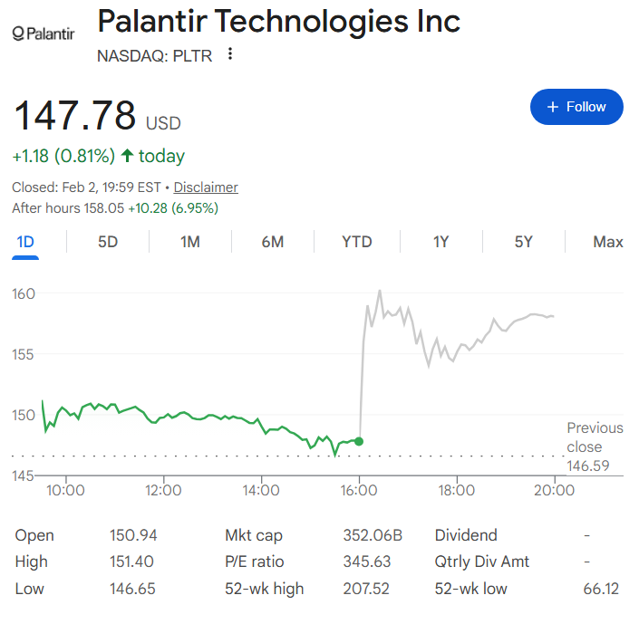 Palantir (NASDAQ: PLTR) stock soared 6.95% in the extended session between February 2 and 3, rising from its latest closing price of $147.78 to its press time price of $158.05.