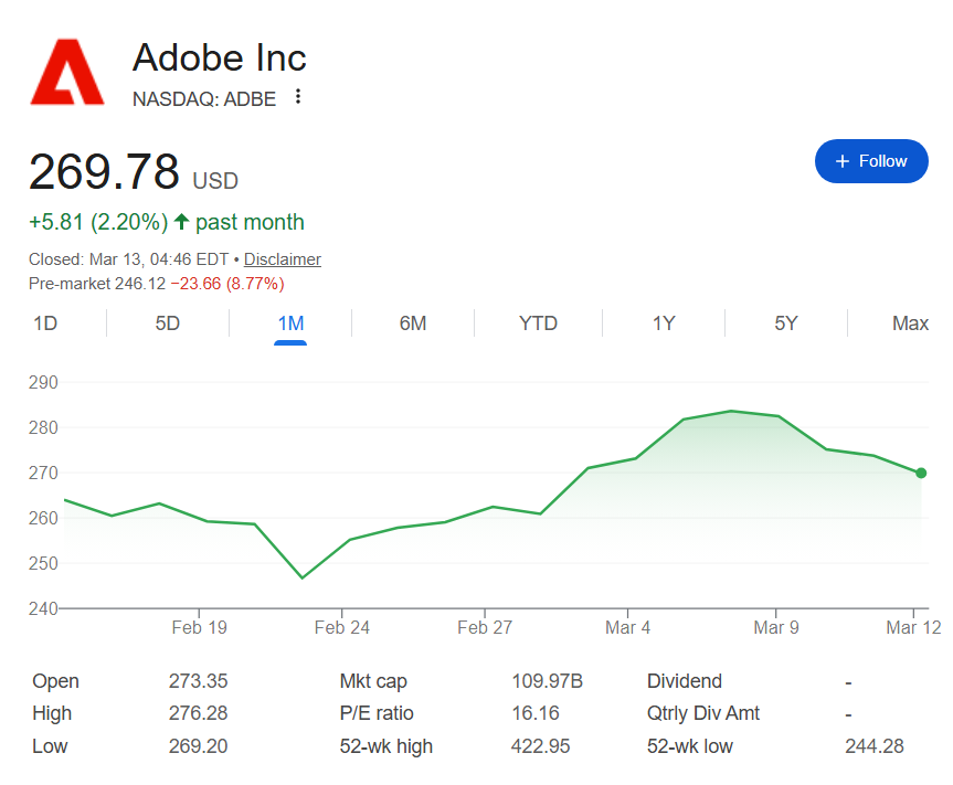 Indeed, by press time on March 13, ADBE is another 8.77% down, having fallen from $269.78 to $246.12: only some $2 higher than the 52-week low of $244.28.