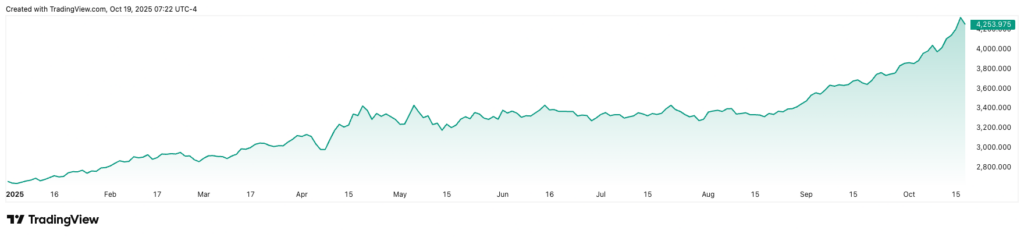 That’s a return of roughly 124%, far outperforming the broader stock market over the same period. The yellow metal has also gained more than 60% year-to-date.