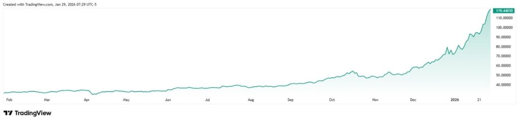 Exactly one year ago – on January 29, 2025 – spot silver prices were hovering at approximately $31, while, at press time on the same day in 2026, they were at a remarkable high of $119.