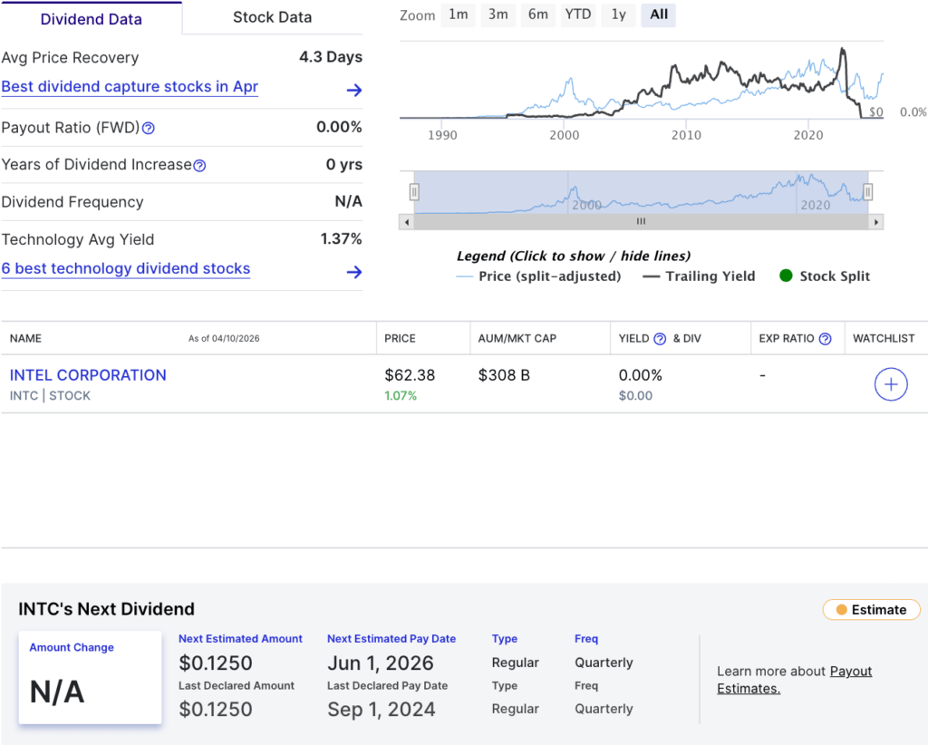 At the time of that final dividend, Intel stock was trading at $22.04. As of press time, INTC shares had climbed to $62, representing a gain of about 181%.