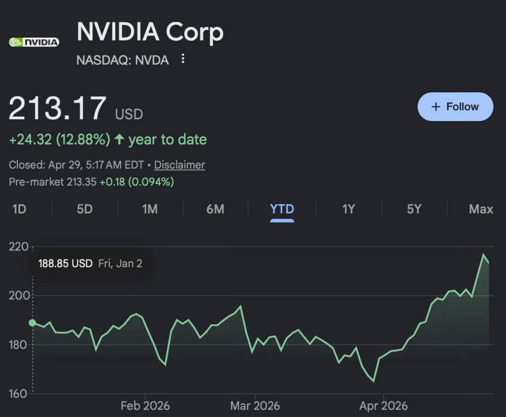 At press time, Nvidia shares were trading much higher, at $213.17, with a total return of 12.88% year-to-date (YTD), meaning a $1,000 investment on January 1 would be worth roughly $1,128.80 today.