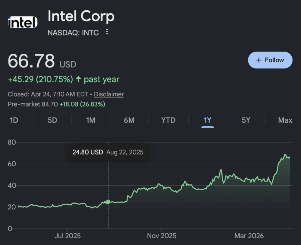 Since the historic agreement, as the tech leader’s initial press release called it, Intel shares have rallied 170%, as of April 24, with apparently no signs of stopping, as the latest earnings reports suggest continued demand.