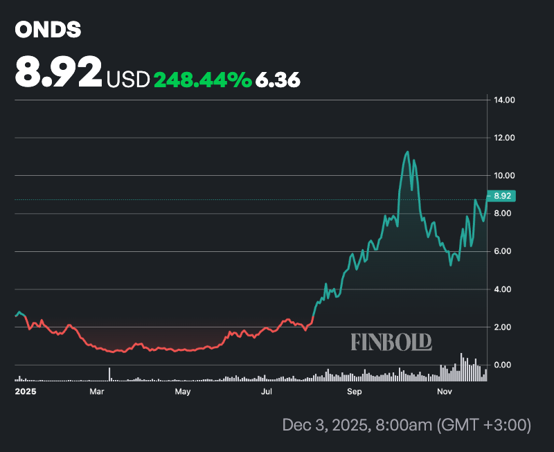 Recent market activity reflects strong revenue growth momentum and expanding exposure to autonomous systems, although the stock has remained volatile as investors assess execution risks tied to scaling and acquisitions. At press time, ONDS was trading at $8.75, up more than 230% year to date.