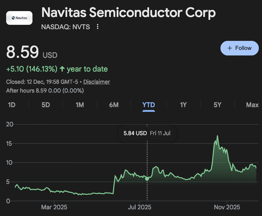Navitas (NASDAQ: NVTS) supplies gallium nitride power chips that improve efficiency in AI data centers and high-voltage applications. While the stock has faced near-term pressure due to cautious guidance and semiconductor cycle concerns, long-term optimism remains tied to GaN adoption as power efficiency becomes critical for next-generation data centers. NVTS was trading at $8.59 at press time, up 145% year to date.
