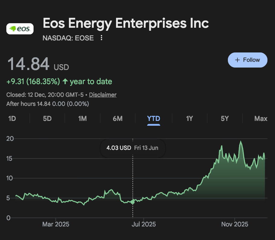 Eos Energy is developing zinc-based energy storage systems designed for continuous, high-load environments such as data centers. As demand for reliable, around-the-clock compute power grows, interest in alternative storage technologies has increased, placing Eos at the intersection of energy infrastructure and AI-driven power needs. EOSE was trading at $14.84 at press time, up 170% year to date.