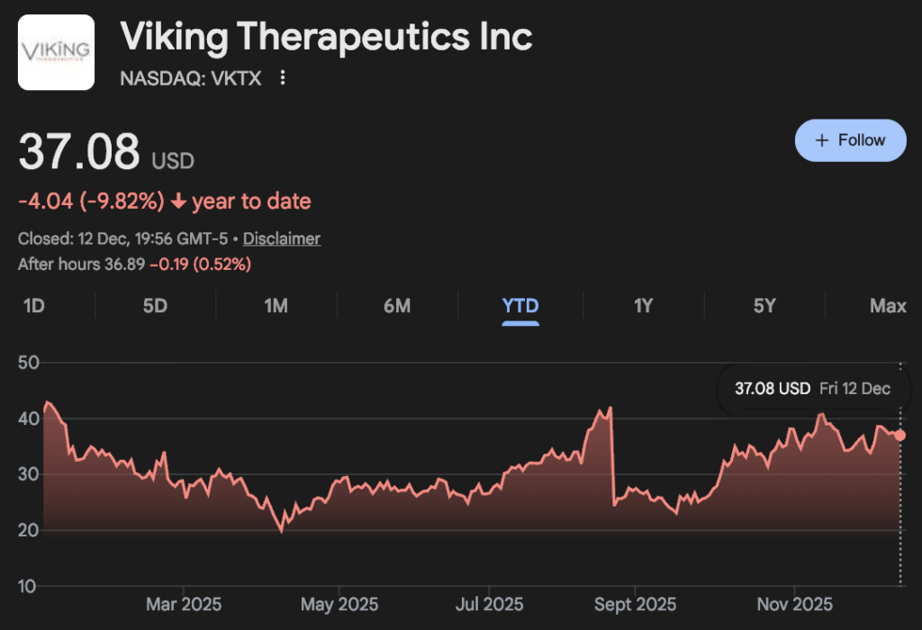 Viking Therapeutics (NASDAQ: VKTX) is developing oral and injectable GLP-1 therapies for obesity and diabetes, positioning it within one of the fastest-growing areas of biotechnology. Investor attention remains high as the broader GLP-1 market continues to expand, with upcoming clinical progress viewed as a key catalyst. VKTX was trading around $37, down about 10%.