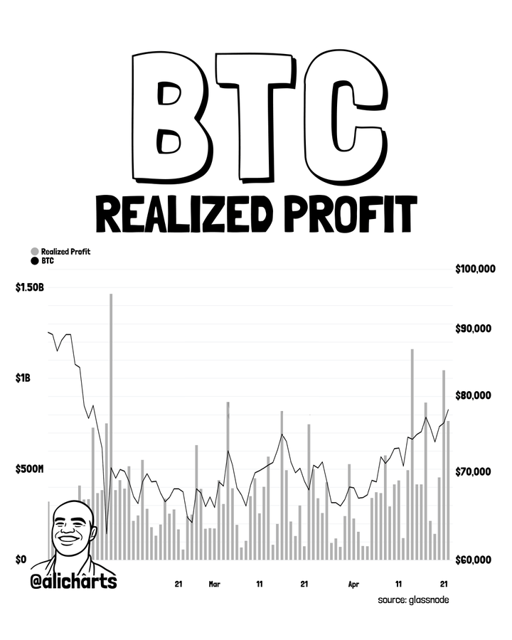 On-chain data shows that investors recorded roughly $5.46 billion in realized profits, according to Glassnode data shared by Ali Martinez on April 25.