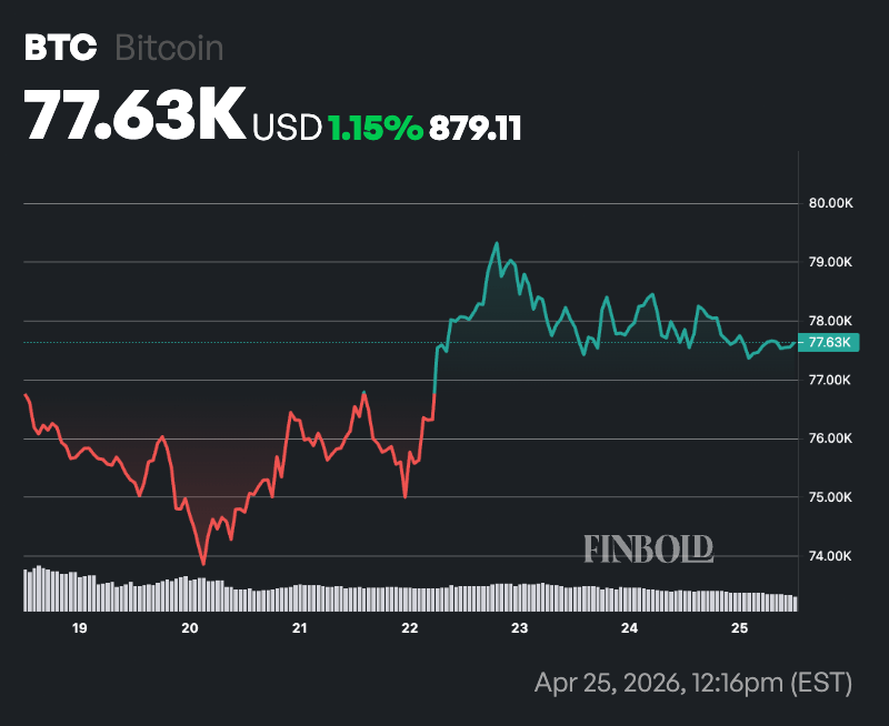 At press time, Bitcoin was trading at $77,636, up about 0.14% over the past 24 hours and roughly 1% on the weekly timeframe.