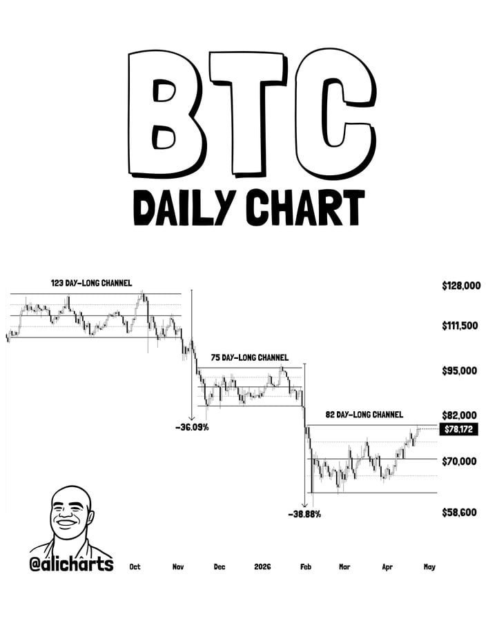 The current 82-day channel, however, points to stabilization, with BTC rebounding toward the upper boundary near $78,000 after holding support in the $58,600 to $70,000 range.