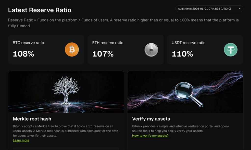 Bitunix offers live Proof of Reserves tracking using a Merkle root hash system. Users can independently verify that their balances are included in the reserve snapshot directly on the Bitunix website, providing continuous, real-time assurance that funds are fully backed.